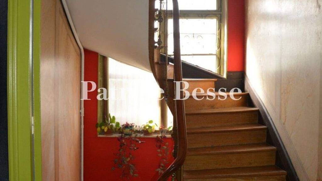Two brick chimney stacks rise up from the slate roof, which has dormers with curved pediments. The first floor has two-leaf windows, whereas the ground floor has single-leaf windows. The first floor also features a balcony with a wrought-iron balustrade in the middle of the facade. Basement windows of wrought iron bring natural light inside the basement. The house offers four bedrooms, two bathrooms, large reception rooms, a kitchen and a second floor that could be converted.