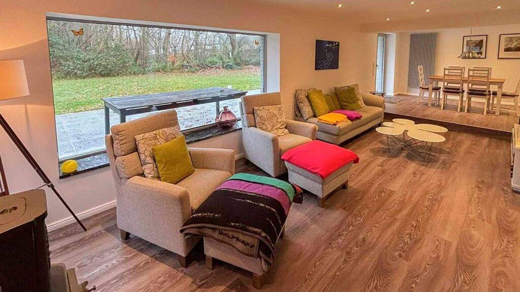 Durch das große Panoramafenster im Wohnzimmer holen Sie sich die Natur ins Haus, während Sie gleichzeitig vor dem kuscheligen Kaminofen entspannen.
