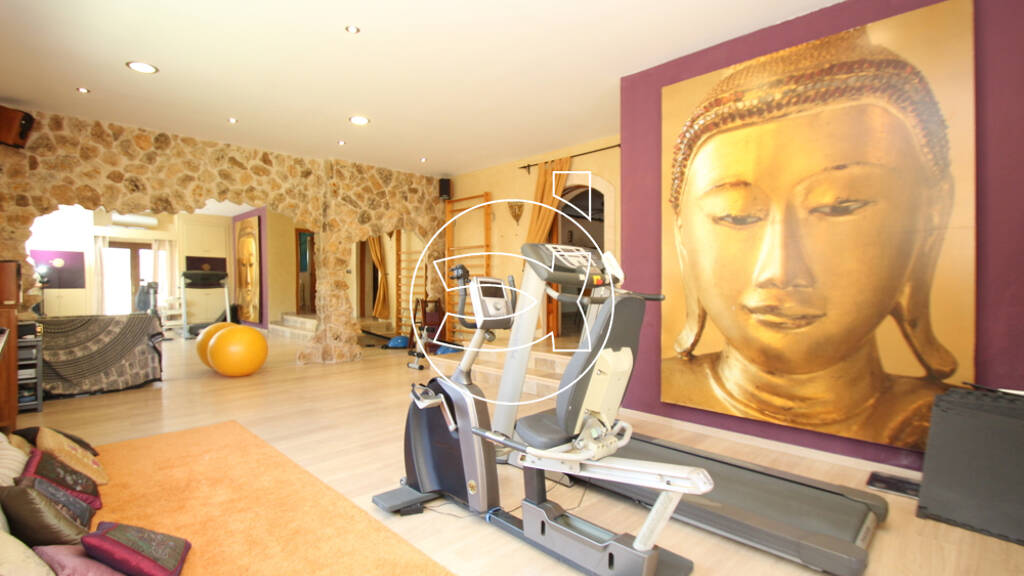Das im Jahre 1977 erbaute und im Jahre 2019 renovierte Einfamilienhaus verfügt über eine bebaute Fläche von 839 m², verteilt auf einem großzügigen und hellen Wohn und Esszimmer mit Zugang zur Küche und einem weiteren Salon mit Kamin, einem Yogaraum mit Badezimmer, einem Schlafzimmer und drei Badezimmern im Erdgeschoss.