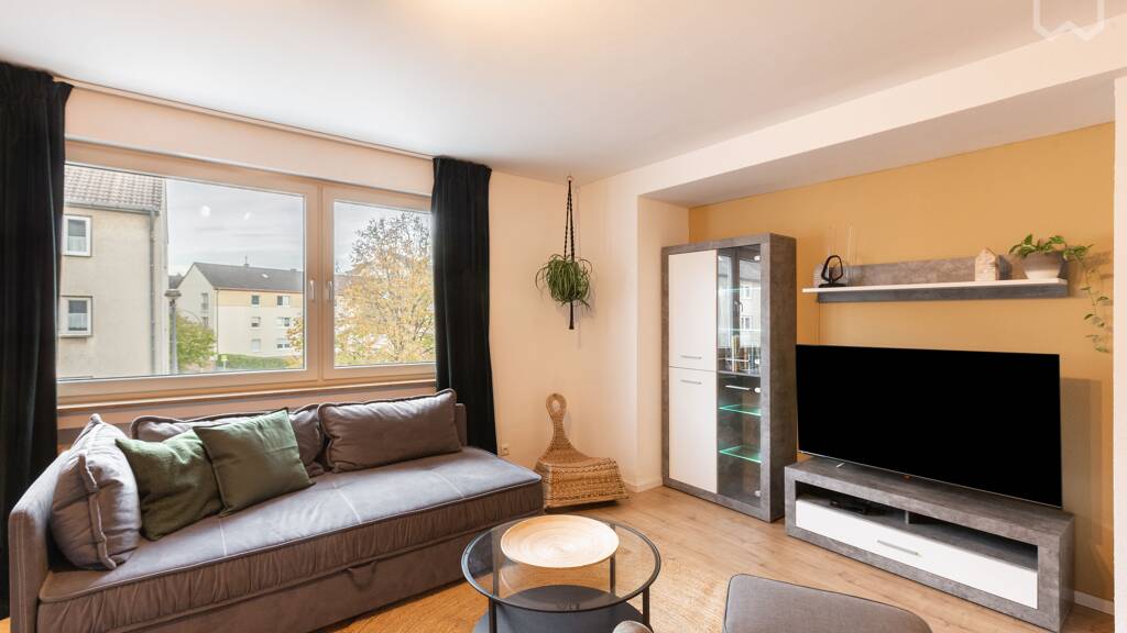 In unserem frisch saniertem 1-Zimmer Apartment mit komfortablem Boxspringbett (120x200cm) erleben Sie die Vorzüge in der Stadt zu wohnen mit Anbindung an den Wald zum durchatmen. Das Apartment ist perfekt für eine Person und funktioniert ebenso super für ein Paar. In den 50 Quadratmetern ist ein Flur mit Abstellkammer vorhanden, das neu sanierte Bad mit Waschmaschine und einem Wannenbad mit Duschabtrennung lädt auch nach einem stressigen Tag zum entspannen ein. Die Küche ist komplett ausgestattet mit Spülmaschine, Kaffeemaschine, Sitzgruppe und angrenzendem Zugang zum Balkon. Im kombiniertem Wohn-/Schlazimmer können Sie in Ihrem Boxspringbett durch die vorhandenen Raumtrenner ungestört schlafen. Ein Schreibtisch, großer LED smart-TV, eine Amazon Alexa und ein gemütlicher Lesesessel runden die Wohnung ab. Alles ist lebendig gestaltet durch echte Pflanzen in jedem Raum und viele Details die diese Wohnung einzigartig machen.