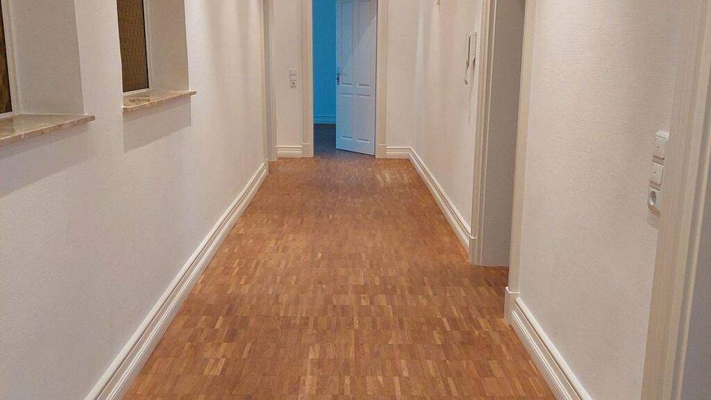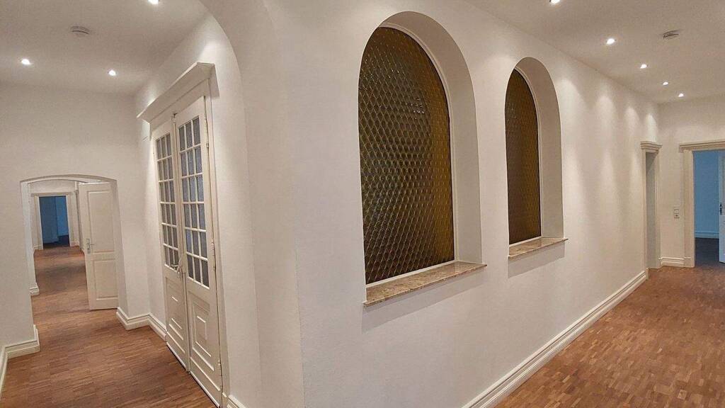 Die großzügige Altbauwohnung verfügt über insgesamt 7 Zimmer sowie eine Küche, ein Badezimmer und ein separates Gäste WC. Ein langer Flur verbindet die einzelnen Räume miteinander und unterstreicht den klassischen Altbaucharakter der Wohnung. Die Räume sind mit weißen Wänden und einem Boden in moderner Holzoptik ausgestattet, wodurch ein helles und freundliches Wohnambiente entsteht. Durch die großzügige Raumaufteilung eignet sich die Wohnung für Familien ideal.