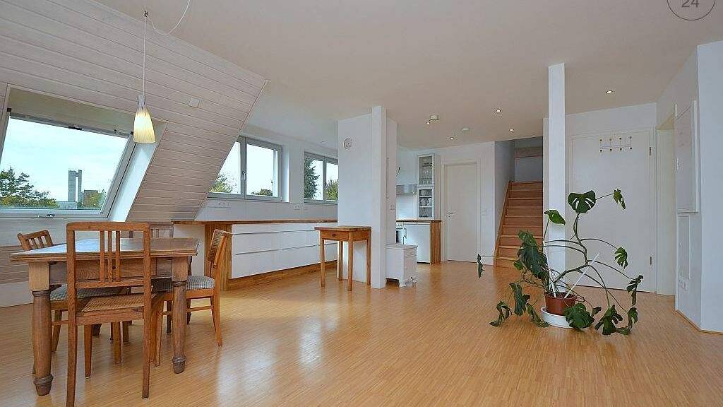 Die Wohnung hat einen tollen, geölten Ahornparkettboden und eine Lüftungsanlage mit Wärmetauscher. Eine offene Treppe führt zum ausgebauten Spitzboden. Hier stehen dem Mieter weitere 15qm Nutzfläche zur Verfügung.