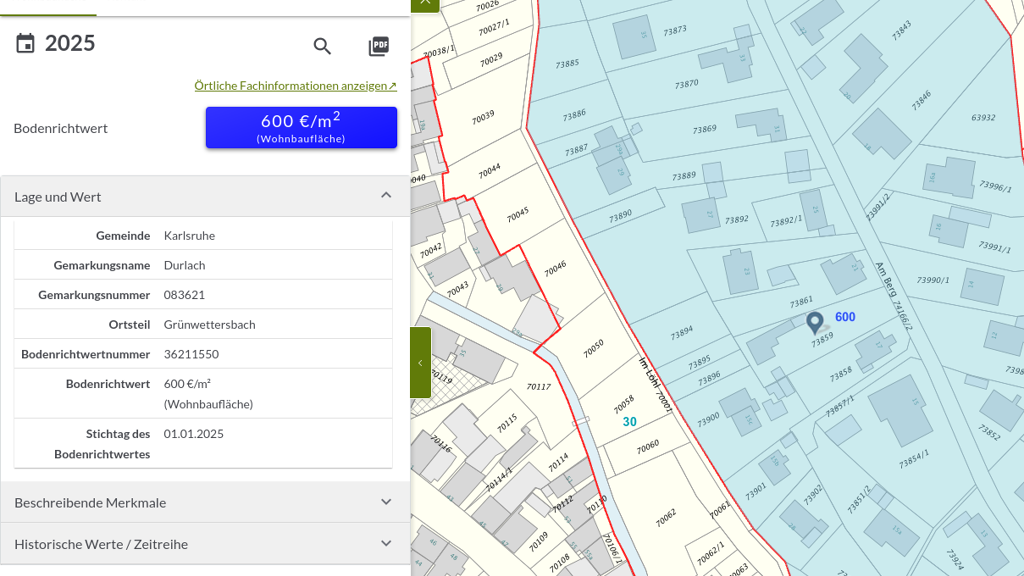 Die Grundstücke in dieser Straße sind komplett erschlossen. Der Bodenrichtwert beträgt zum 01.01.2025 laut Bodenrichtwertinformationssystem Baden-Württemberg Boris-BW 600,-- Euro /qm Grundstücksfläche. Wir orientieren uns an diesem Wert und werden den Preis nicht zusätzlich in die Höhe treiben, wobei es durchaus sein kann, dass die Bodenpreise weiter steigen.