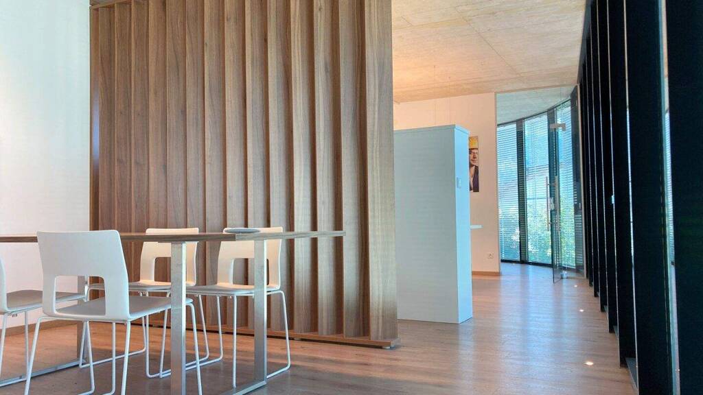 * Bürofläche mit ca. 83 m², barrierefrei * zentrale Lage mit schöner Aussicht * teilmöbliert, hochwertige Büromöbel, Rezeption und 3 Arbeitsplätze, Schränke, Besprechungstisch samt Stühlen, Kaffeeküche mit Geschirrspüler, Abstellraum/Archiv * Sanitäranlage in der Einheit und im Stiegenhaus * pflegeleichter, wischbarer Boden * raumhohe ESG Verglasung mit elektrischen Jalousien * thermische Doppelglaskonstruktion der Fassade für moderate Betriebskosten * effiziente Grundwasserwärmepumpe * gutes Raumklima mit Fußbodenheizung und -Kühlung * verkehrsgünstig direkt beim Kreisverkehr an der Bundesstraße in zentrumsnähe * Freistellplätze, Garagenparkplätze, Lager im UG auf Anfrage