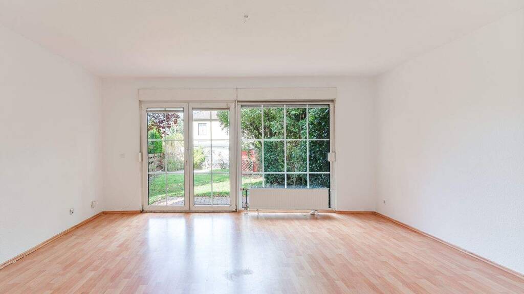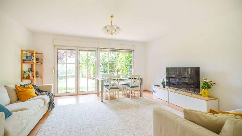 Das Erdgeschoss empfängt mit einem hellen, großzügigen Wohnzimmer, das sich zur ca. 10 m² großen Terrasse und in den privaten Garten öffnet. Die grüne Außenfläche ist ideal für Spiel, Erholung oder gesellige Stunden im Freien. Direkt angrenzend befindet sich die separate Einbauküche, die praktisch eingerichtet ist und den täglichen Komfort sichert. Ein Gäste-WC und ein Abstellraum ergänzen diese Ebene.