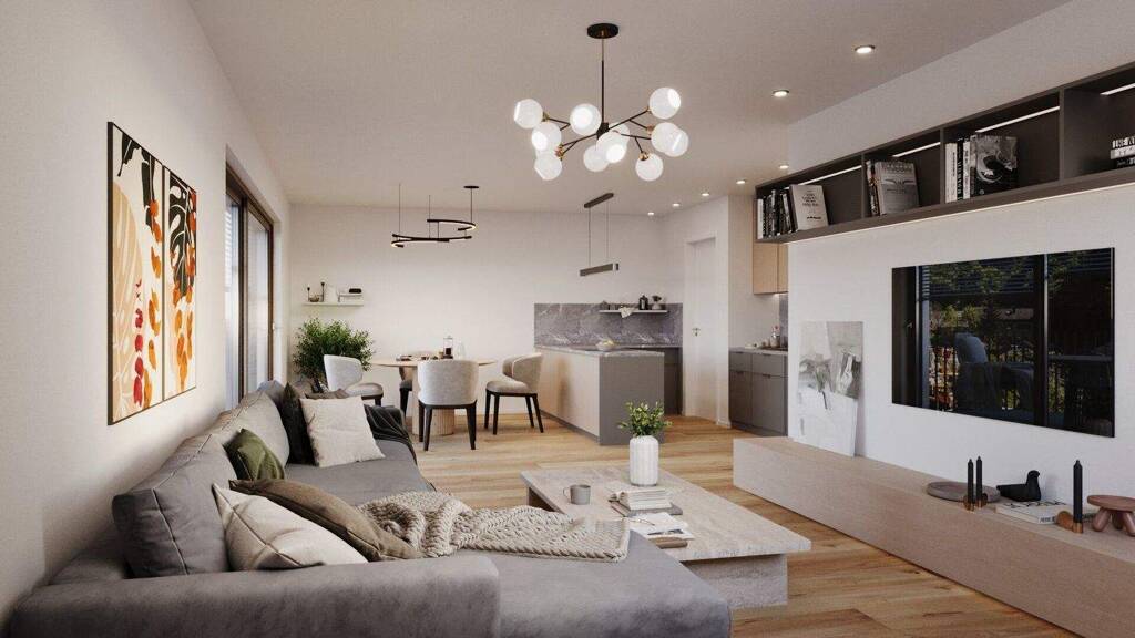 Wohn-, Ess- und Kochbereich (34,02 m²): Durch eine moderne Glaspendeltür erreichbar, befinden sich hier die offene Küche mit dem angrenzenden Essbereich. Der einladende Wohnbereich schafft Raum für Ihre Couch und erholsame Stunden.