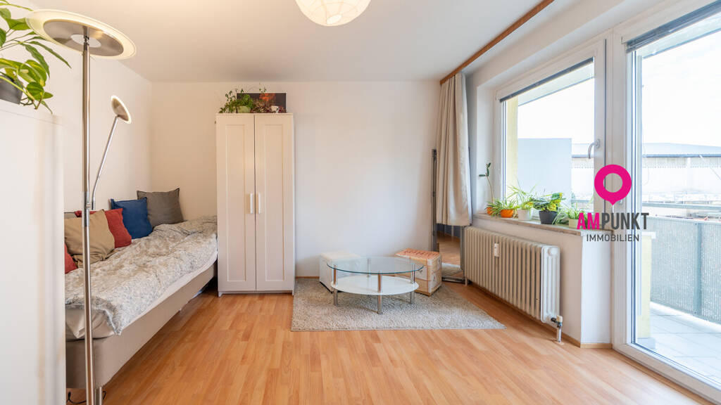 Der Wohnraum lässt sich klar in Schlaf- und Wohnbereich gliedern. Bett, Sofa und Tisch finden Platz, ohne dass es eng wird. Der Balkon ist westseitig ausgerichtet.