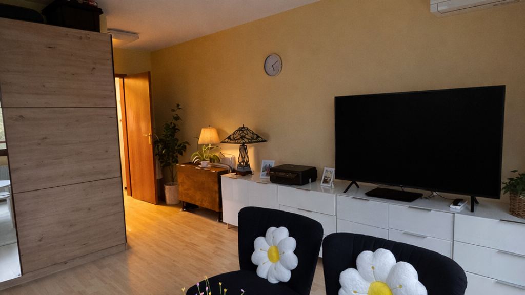 Die funktionale Raumaufteilung umfasst eine separate Küche, ein kleines Badezimmer mit Badewanne sowie einen großzügigen Balkon, der zum Entspannen und Verweilen einlädt. Der Balkon erweitert den Wohnraum ins Freie und bietet einen idealen Rückzugsort. Große Fensterfronten durchfluten die Räume mit Licht und schaffen eine freundliche, angenehme Atmosphäre. Besonders hervorzuheben ist das klimatisierte Wohnzimmer, das zudem eine gemütliche Schlafecke mit einem Bett integriert.