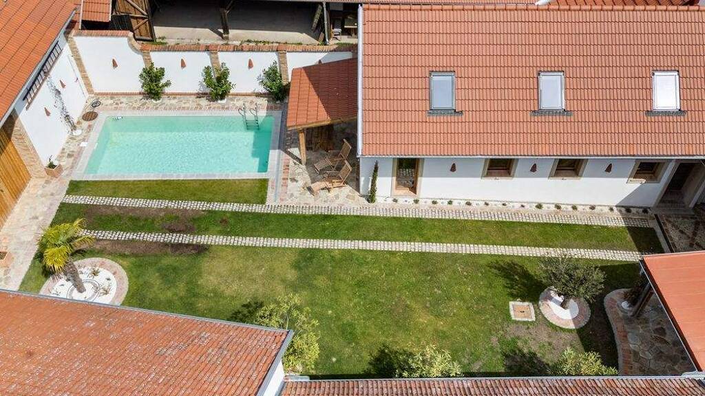 Der Gutshof und das Atelier sind durch den geschützten, gepflegten Innenhof miteinander verbunden. Der Außenbereich mit großzügigem Pool lädt zum Entspannen und Genießen ein.