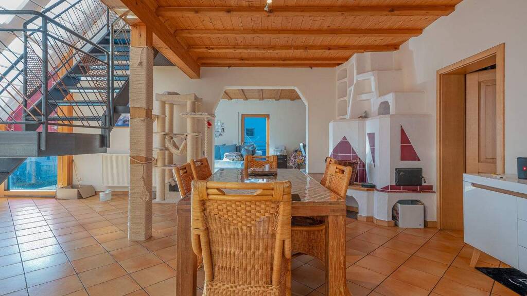 Galeriewohnung – Großzügiges Wohnen mit besonderem Flair. Im Obergeschoss erwartet Sie eine beeindruckende 194 m² Galeriewohnung, die mit einem großen Wohn- und Essbereich, offener Küche und angrenzender Bar mit Wintergartenflair begeistert. Zudem gibt es ein Duschbad mit integrierter Sauna, ein Schlafzimmer, ein Gäste-WC und einen repräsentativen Eingangsbereich. Im Wohnzimmer sorgt ein gemütlicher Kachelofen für behagliche Atmosphäre. Die moderne Einbauküche, die erst 2024 neu angeschafft wurde, wird für 20.000 € mit verkauft.