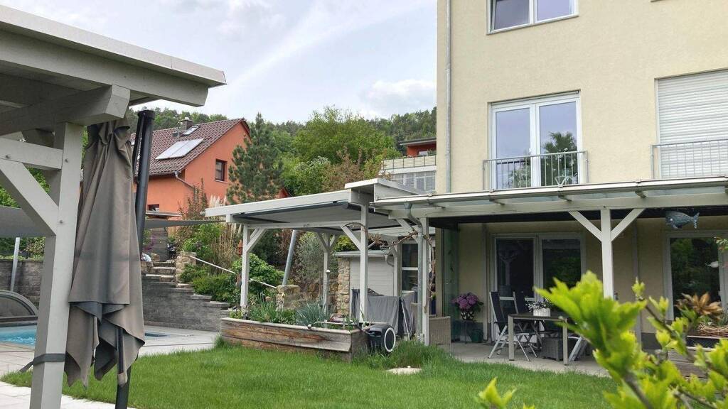 Im gepflegten Garten mit allen erdenklichen Annehmlichkeiten, wie großer Terrasse, Pool, Gartenküche uvm. lässt es sich nach ihrem Arbeitstag schneller erholen.