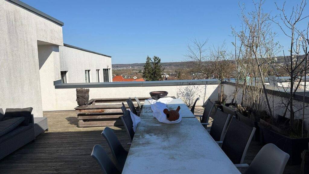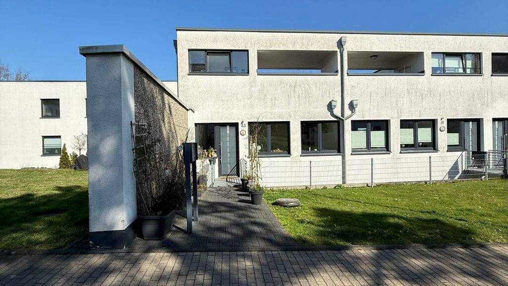 Es handelt sich um ein außergewöhnliches TOWNHAUS mit Wohnküche, Wohnzimmer sowie 2 Schlafzimmern und großer Dachterrasse in individueller Architektur und komfortabler Ausstattung auf einem parkähnlichen Grundstück in HENNEF / GEISTINGEN. Die Liegenschaft befindet sich innerhalb eines in Anlehnung an den Bauhaus-Stil komplett kernsanierten Ensembles bestehend aus insgesamt 4 Stadthäusern und 5 weiteren Eigentumswohnungen, das in den Jahren 2008/2009 aufwendig kernsaniert wurde. Individuelle und doch optimale Aufteilung: über einen kleinen Eingangsflur erreichen Sie die Wohnküche, das Wohnzimmer und das Gäste-WC. Auf der oberen Wohnebene - zwischen Küche und Wohnbereich - befindet sich auch ein praktischer Vorrats-/Abstellraum. Vom Eingangsflur aus gelangt man über eine Treppe auf die rd. 40 m² große, teilweise überdachte, Dachterrasse mit einem zusätzlichen Abstellraum für Terrassenmöbel etc. Auf der unteren Wohnebene befinden sich die beiden Schlafzimmer und das sehr schöne Tageslichtbad mit Badewanne sowie Dusche. Auf dieser Ebene liegt auch der Hauswirtschaftsraum mit Anschluss für Waschmaschine und Trockner sowie weiterem Stauraum.