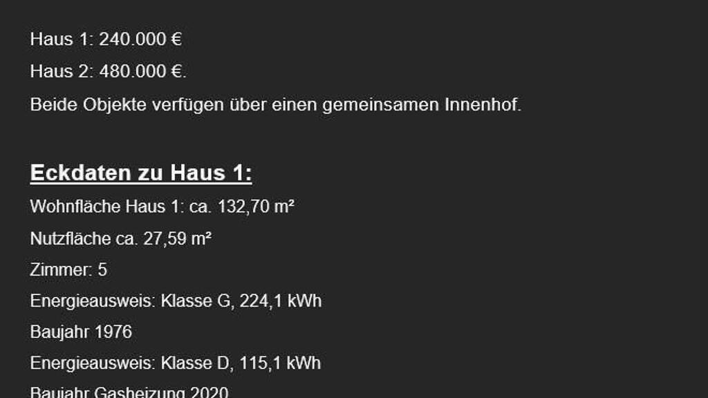 Die jeweiligen Hälften wurden zur besseren Übersicht getrennt eingestellt. Die beiden Objekte werden jedoch nur en bloc verkauft, der