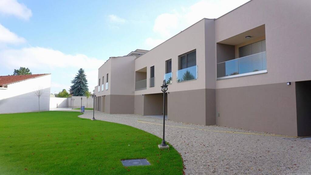Rohbau:Die Tragstruktur besteht aus Ziegelmauerwerk (Porotherm 25 cm) und Stahlbeton. Fundamente werden in Stahlbeton gemäß statischen Anforderungen ausgeführt. Treppen und Geländer:Haupttreppe in Stahlbeton, Handläufe aus verzinktem Eisen und Glasgeländer für Terrassen/Balkone. Wände:Außen- und Innenwände aus Stahlbeton und Ziegel, verputzt und weiß gestrichen. Fassade mit 20 cm Vollwärmeschutz (Farben: Kreisel T54 I und T58 I). Fenster:ALU-Fenster (ALIPLAST GENESIS) mit 3-fach Isolierverglasung, Alu-Jalousien und Dreh-Kipp-Beschlägen. Insektenschutzgitter auf Wunsch erhältlich. Decken:Stahlbetondecken, malerfertig gespachtelt und weiß beschichtet. Sanitär:Moderne Anschlüsse für WC, Waschbecken, Badewanne und bodengleiche Dusche; Küchenanschlüsse gemäß Skizze. Heizungssystem:Die Beheizung der Wohnungen erfolgt über vier Luftwärmepumpen (Vaillant aroTHERM VWL 125/5) in Split-Anlage. Diese ermöglichen eine effiziente Wärmeabgabe über eine Niedertemperatur-Fußbodenheizung, während die Ventilatoreinheit auf dem Flachdach installiert wird. Warmwasser-Aufbereitung:Für die Warmwasserbereitung steht pro vier Wohnungen ein 400 l Warmwasserspeicher sowie ein 300 l Pufferspeicher zur Verfügung. Diese Systeme gewährleisten eine bedarfsgerechte Warmwasserversorgung für alle Bewohner und tragen zur Energieeffizienz des gesamten Gebäudes bei. Versorgung:Anschluss an das öffentliche Versorgungsnetz, Abwasserentsorgung und Oberflächenwässer werden über Versickerungsanlagen behandelt.