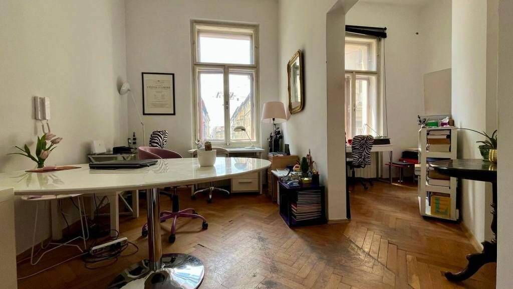 Wir verkaufen eine geräumige bürgerliche Vierzimmerwohnung mit hohen Decken sowie einen zugehörigen Geschäftsraum mit einer Fläche von ca. 15 m2. Die Immobilien befinden sich nebeneinander im 1. Stock eines Wohngebäudes in der Palmoticeva Straße. Die Wohnung besteht aus 4 Zimmern, einem Esszimmer mit Küche, 2 Badezimmern mit WC sowie einem separaten WC. Zur Wohnung gehört außerdem ein Kellerabteil sowie ZWEI AUSSENPARKPLÄTZE im Innenhof des Gebäudes.