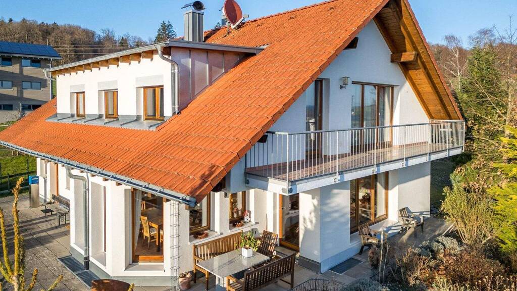 Großzügiges Raumangebot: Das Erdgeschoss: Auf knapp 100 m² erwartet Sie ein durchdachtes Raumkonzept. Besonders hervorzuheben ist das lichtdurchflutete Ensemble aus Wohn- und Esszimmer, welches durch eine großzügige Schiebetür getrennt ist. Die meisterhaft angefertigte Einbauküche und das voll ausgestattete Badezimmer (inkl. Bidet und Dusche) lassen keine Wünsche offen. Ein Highlight ist die gigantische, teilweise überdachte Terrasse mit ca. 104 m² - der perfekte Ort für gesellige Grillabende. Das Dachgeschoss: Diese Ebene überzeugt mit einem ca. 31 m² großen Studio, charmanten Dachschrägen und einem Balkon, der eine einzigartige Sicht auf die Schweizer Alpen bietet. Es kann wahlweise als autarke 3-Zimmer-Wohnung mit eigener Küche oder als zusätzliche Schlafetage genutzt werden. Das Untergeschoss: Neben Technik- und Stauräumen bietet das voll unterkellerte Haus einen ausgebauten Bereich (ca. 33 m²) mit Tageslicht, Sauna und eigenem Bad - ideal als Gästebereich oder Wellness-Oase.
