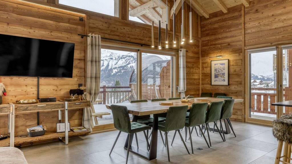 It accommodates up to 12 people in 5 spacious bedrooms, making it ideal for holidays with family or friends. The bright living area, with its high ceilings and exposed beams, offers breathtaking views of the Aravis mountain range through its large bay windows. The interior combines natural wood and contemporary design for a warm and elegant atmosphere.