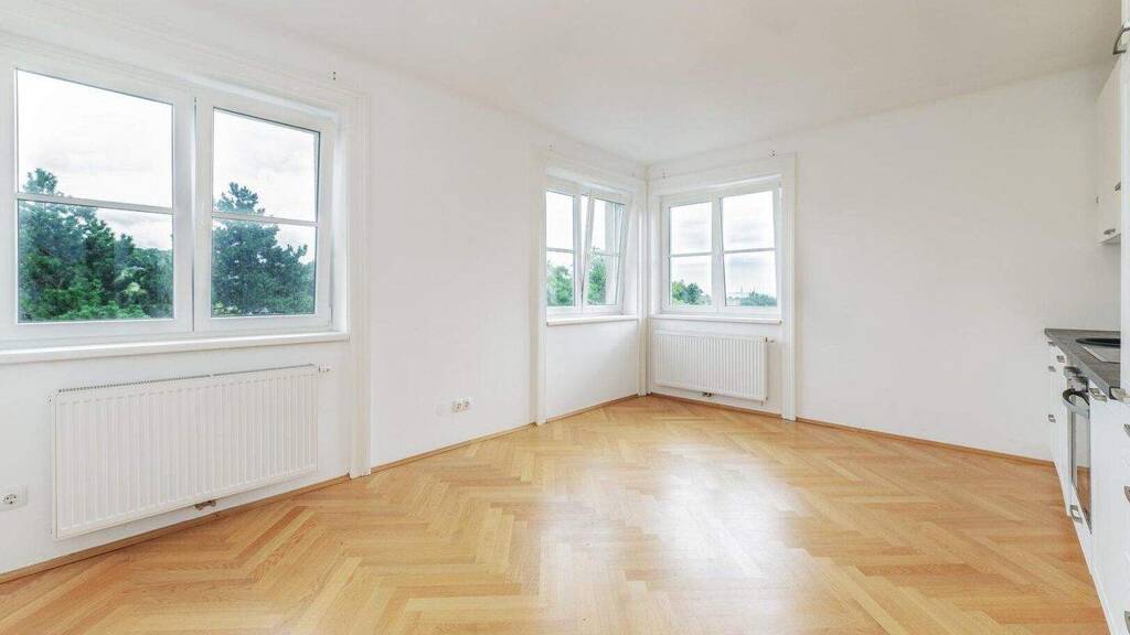 Das Highlight der Wohnung ist die lichtdurchflutete Wohnküche. Die Fenster blicken nach Norden in die verkehrsberuhigte und begrünte Wlassakstraße sowie nach Osten über die Dächer des 13. Bezirks. Die Küche ist mit einem Backofen, einem Kühlschrank mit Gefrierfach und einem Dunstabzug ausgestattet. Das Badezimmer verfügt über eine Badewanne, ein Waschbecken, einen Waschmaschinenanschluss, der Toilette sowie ein Fenster. Die Beheizung und Warmwasseraufbereitung erfolgt über eine Gasetagenheizung.