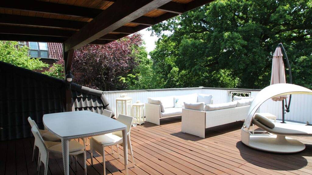 * 51 m² große, mit Echtholz belegte Süd/West-Dachterrasse (zum Teil überdacht) sowie ein zusätzlicher Balkon