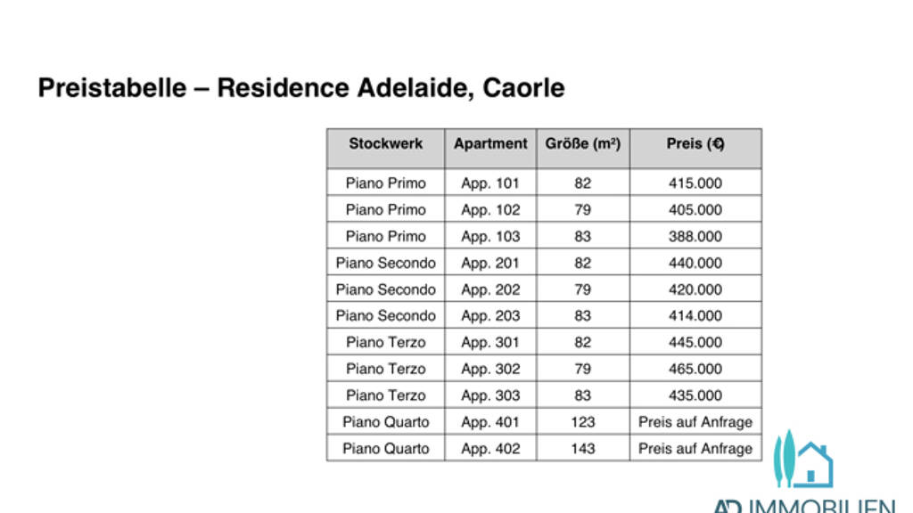.Preisspanne: 388.000 - 465.000 € (je nach Stockwerk und Größe) .Attici (Dachwohnungen): Preise auf Anfrage .Auf alle Preise fällt zusätzlich 10 % IVA (Mehrwertsteuer) an, da es sich um Neubauten handelt .Stellplatz in der Tiefgarage ist im Preis enthalten .Die Verfügbarkeit kann sich ändern - bitte immer aktuelle Informationen anfragen