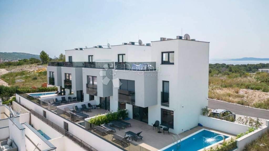 Eine luxuriöse Villa steht in äußerst attraktiver Lage auf der Insel Ciovo zum Verkauf. Die erhöhte Lage der Villa bietet einen wunderschönen Panoramablick auf das Meer. Sie erstreckt sich über drei Etagen. Das Erdgeschoss verfügt über eine Eingangshalle, einen großzügigen offenen Raum, der Küche, Esszimmer und Wohnzimmer vereint, sowie ein Gäste-WC. Große Glaswände sorgen für viel Tageslicht und verbinden den Innen- mit dem Außenbereich, wo sich der Pool und das Sonnendeck befinden. Eine Innentreppe führt in den ersten Stock, wo sich drei Schlafzimmer befinden. Das Hauptschlafzimmer verfügt über ein eigenes Bad, während sich zwei weitere Schlafzimmer ein modernes Badezimmer teilen. Im zweiten Stock befinden sich eine überdachte Sommerküche, ein WC und eine geräumige, nicht überdachte Terrasse, die zum Entspannen bei spektakulären Sonnenuntergängen und herrlichem Meerblick einlädt. Zur Villa gehören ein Swimmingpool mit Sonnendeck, ein Grillplatz und ein wunderschön angelegter Garten mit einheimischen mediterranen Pflanzen. Parkplätze stehen für mehrere Fahrzeuge zur Verfügung, und das gesamte Anwesen ist für zusätzliche Sicherheit videoüberwacht. Alle notwendigen Einrichtungen befinden sich in unmittelbarer Nähe, während der internationale Flughafen nur 10 km entfernt ist. Es stehen vier Villen in einer Reihe zur Verfügung: Villa 1: Wohnfläche 108,53 m + Terrasse 213,26 m 650.000 Villa 2: Wohnfläche 109,75 m + Terrasse 130 m 600.000 Villa 3: Wohnfläche 108,53 m + Terrasse 111,31 m 600.000 Villa 4: Wohnfläche 108,53 m + Terrasse 226,68 m 650.000 Der Verkäufer ist eine juristische Person, die angegebenen Preise verstehen sich zzgl. MwSt. Es besteht die Möglichkeit, die gesamte Anlage im Paket zu erwerben!