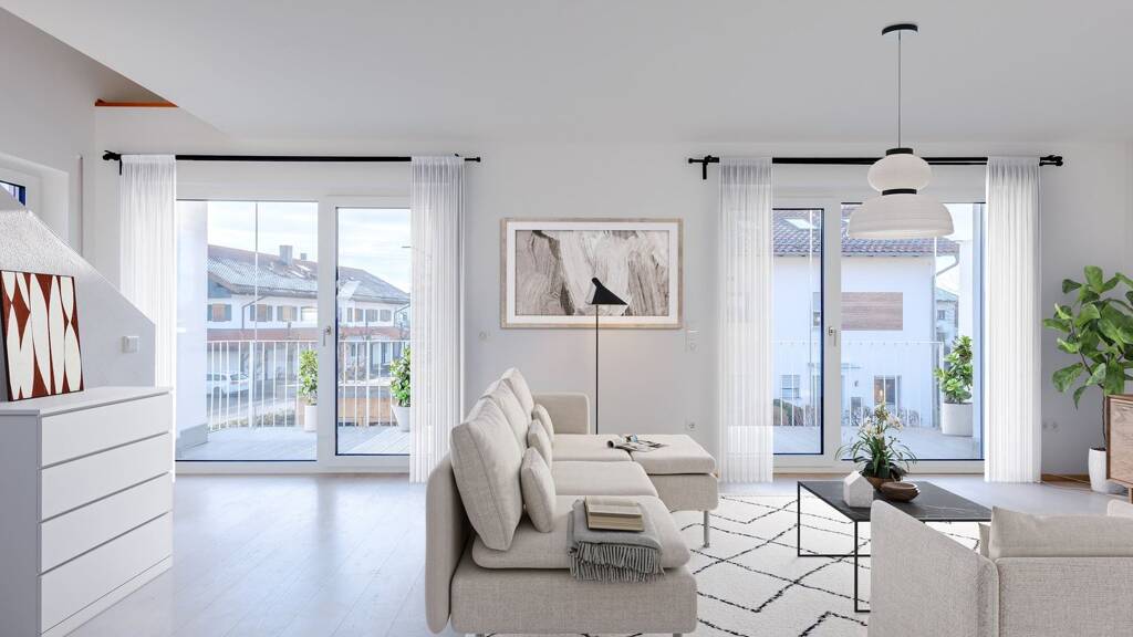 Sonniges Wohnen in dieser modernen Maisonette-Wohnung mit einer Wohnfläche von ca. 88 m² erleben. Das Objekt wurde 2014 in solider Massivbauweise errichtet und präsentiert sich in einem gepflegten Zustand. Über zwei Etagen (1. Obergeschoss mit Treppe vom eigenen Hauseingang erreichbar sowie Dachgeschoss, ebenfalls über eine Innentreppe erreichbar) erstrecken sich drei Zimmer: ein Wohn-/, Koch- und Essbereich, zwei Schlafzimmer sowie ein Tageslicht-Badezimmer mit Dusche und Badewanne. Ein praktisches, separates Gäste-WC ist ebenfalls vorhanden. Die Räumlichkeiten sind sehr hell und freundlich gestaltet und bieten viel Platz für individuelle Wohnträume. Im großzügigen Wohn-/, Koch- und Essbereich strahlt durch die bodentiefe Verglasung nach Süden viel Tageslicht ein. Die moderne offene Küchenecke mit Esstheke lässt sich auch gut um einen gemütlichen Essplatz ergänzen. Eine überdachte Loggia auf der gesamten Breite der Wohnung lädt mit Bergblick nach Südost und Südwest ein. Über eine gemauerte Innentreppe erschließt sich das Dachgeschoss mit Badezimmer und zwei Schlafzimmer auf gegenüberliegenden Seiten. Große Dachflächenfenster sorgen auch hier für sehr viel Lichteinfall. In den Dachschrägen lassen sich individuelle Aufbewahrungsmöbel gut integrieren. Für Schlafzimmerschränke bieten sich die hohen Innenwände an. Im Dachgeschoss sind unter den Dachschrägen begehbare Speicher eingebaut, welche als Nutzfläche und Abstellräume genutzt werden können. Zur Wohnung gehört kein separater Keller oder Kellerabteil. Zur Verfügung stehen zwei nicht überdachte Außenstellplätze direkt vor dem Hauseingang, welche exklusiv zur Wohnung gehören. Ein Garten gehört nicht zum Objekt, jedoch bieten die umliegenden Grünflächen ausreichend Möglichkeiten für Erholung und Freizeitgestaltung.