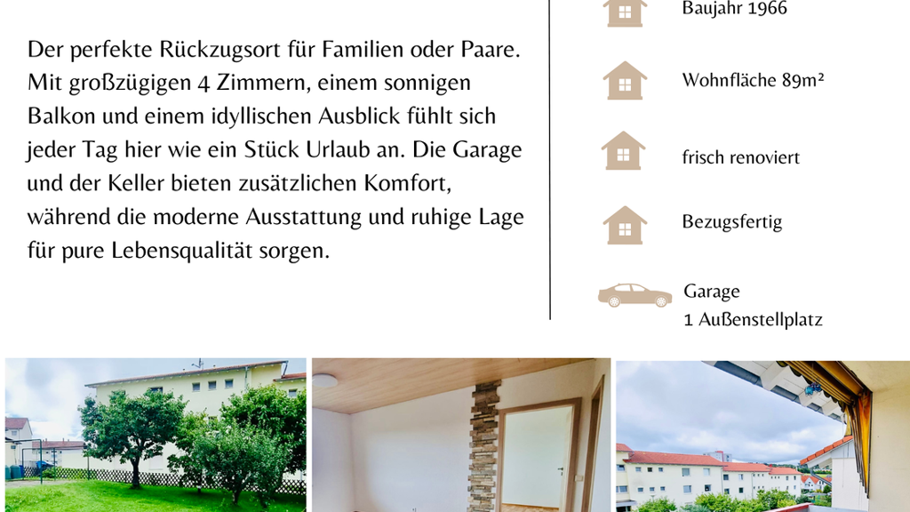 Diese 2025 frisch renovierte 4-Zimmer-Etagenwohnung befindet sich im 2. Stock eines gepflegten Mehrfamilienhauses aus dem Jahr 1966. Mit einer großzügigen Wohnfläche von 88,62 m² bietet die Wohnung ausreichend Platz für Familien oder Paare, die sowohl Komfort als auch eine ruhige Lage suchen.