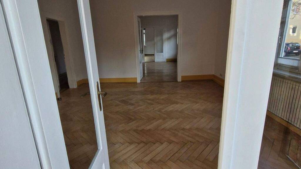Vom Flur aus, der mit einem rustikalen Dielenboden verlegt ist, befindet sich auf der linken Seite hinter der Eingangstür das Gäste-WC, daran schließt sich die geräumige Küche an. Es folgt das erste Bad mit Dusche und WC, vor dem sich - durch eine Schiebetür getrennt - ein Abstellbereich mit Waschmaschinenanschluss befindet. Direkt dahinter liegt das zweite Bad mit großzügiger Dusche, Badewanne, WC, Bidet und Pissoir. Der komplette Wohnbereich reiht sich daran an. Wir befinden uns schon fast auf der anderen Seite, wobei das erste Schlafzimmer vom Flur aus geradewegs durch liebevoll aufbereitete Kassettentüren zu erreichen ist. Alle Wohnräume sind entweder mit Parkettboden oder hochwertigem Fischgrätenparkett ausgestattet. Das zweite Schlafzimmer, nun auf der rechten Seite, führt durch Flügeltüren mit Glaselementen zum dritten Schlafzimmer, durch das man wiederum zum Wohnzimmer mit Loggia gelangt.