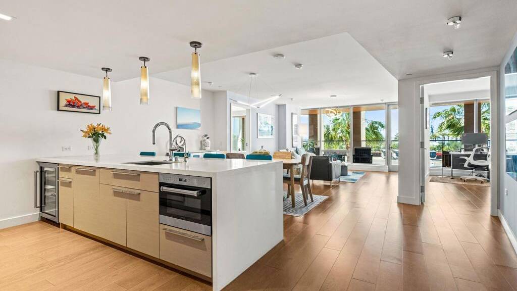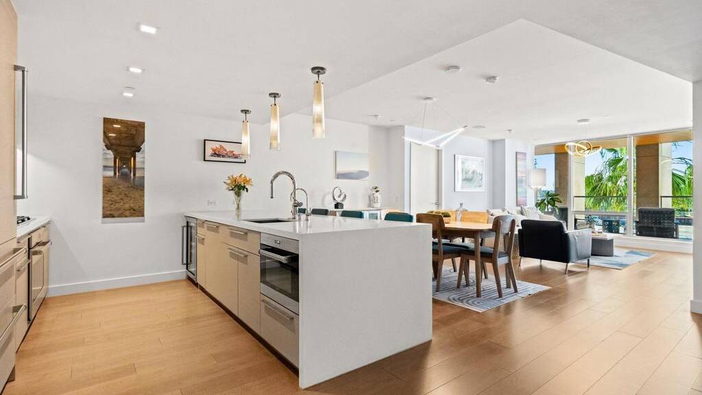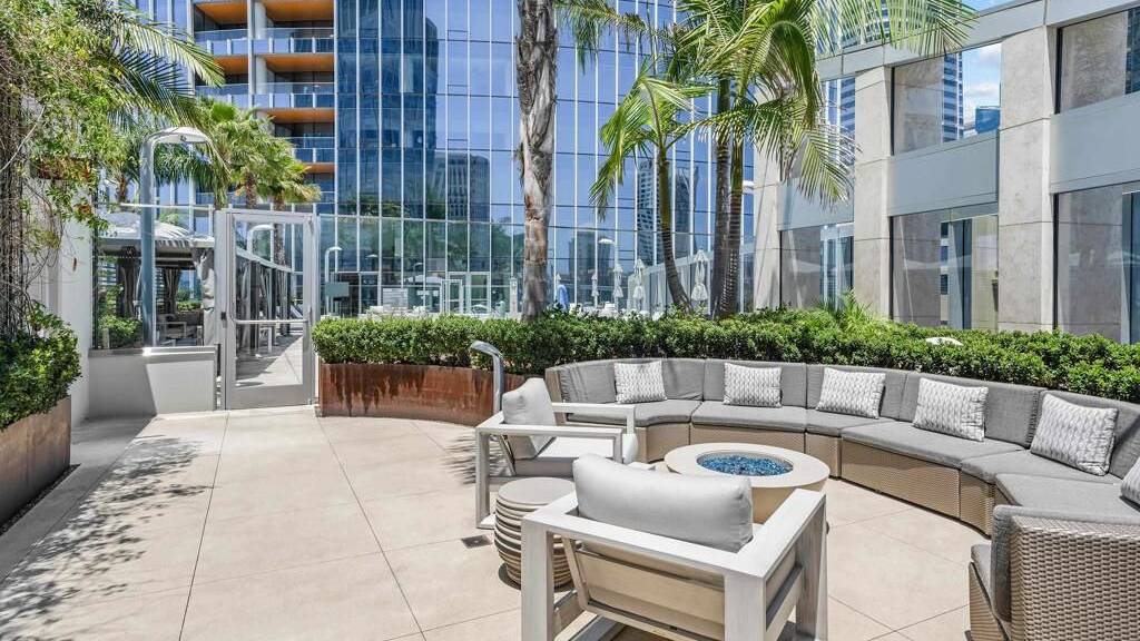Experience luxury coastal living in this beautiful west-facing residence with soft sunset and glistening bay views. Featuring one of the largest private covered terraces at Pacific Gate, this unique floor plan offers an expansive outdoor retreat rarely found in high-rise living. The gourmet kitchen showcases touch-open cabinetry, Sub-Zero, Wolf, and Miele appliances, plus a wine chiller. The dining and living areas are enhanced with California Closets built-ins, including a multi-functional pantry, floating wine glass cabinet, and a built-in Napoleon electric fireplace. Control media, climate, lighting, and window shades with ease through the in-home panel or ELAN mobile app. The primary suite features dual California Closets valets and a spa-like bath with heated floors, walk-in shower, soaking tub, and LED mirror with integrated TV. Privately located along a quiet corridor in the building, this residence offers convenient access to the business center, conference room, and screening room, ideal for a work-from-home lifestyle. Pacific Gate amenities include 24/7 concierge and security, private yacht and luxury car fleet, resort-style pool and spa, sauna, steam room, fitness center, and outdoor spaces with BBQs, fire pits, and lounges. Residents also enjoy a community and screening room for hosting. Includes 2 premier parking spaces and a large private storage unit on P1. Ideally located in the heart of San Diego's waterfront, just moments from top dining, parks, and everyday conveniences. Residence 307 brings together privacy, comfort, and a resort-style feel. The first all-glass Super Prime residential tower in San Diego offers an unprecedented waterfront lifestyle with sky-high amenities and picture-postcard views. Directly overlooking the waterfront, the 41-story tower contains an exclusive offering of homes designed by Hirsch Bedner Associates. Renowned New York-based architectural firm Kohn Pedersen Fox (KPF) created a landmark that reimaged the San Diego skyline. The custom-engineered glass walls dynamically reflect the hues of the sky and the Pacific Ocean. Pacific Gate has evolved the San Diego skyline and represents the future of the city. The building is comprised of two-nested curved glass towers that rise as a single column from a three-story ground floor retail podium on the north and west sides of the tower. Because of the building's curves and exterior glass, Pacific Gate offers a striking viewing experience from every vantage point. Residents arrive home to a beautifully landscaped motor court with a private luxury car fleet, which leads to a double-height lobby with a 24-hour concierge and porter services. Two levels of amenities boast a residents lounge ideal for events and everyday use, the fitness center contains an extensive range of state-of-the-art equipment. Adjacent to the fitness center is the steam and sauna retreats that open up to the fourth-floor pool terrace fitted with poolside cabanas and glass surround.