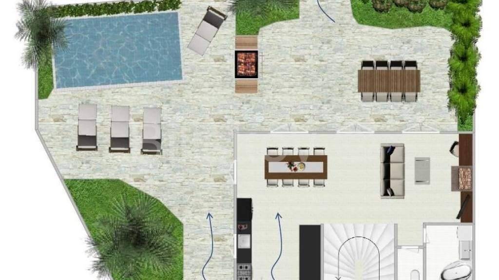 Der Außenbereich des Hauses besteht aus einer großen Terrasse mit direktem Zugang zum Strand, auf der sich auch ein Pool mit 20 m befindet.