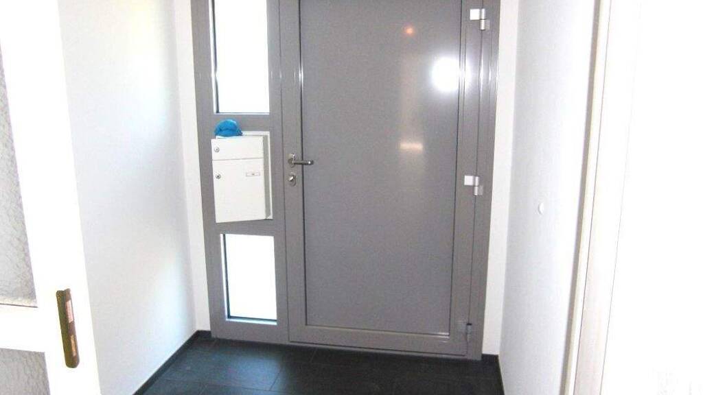 Der praktische Windfang ist mit den eleganten, pflegeleichten schwarzen Fliesen in Schieferoptik versehen und macht durch die neue, platingraue Haustür einen sehr schicken Eindruck.