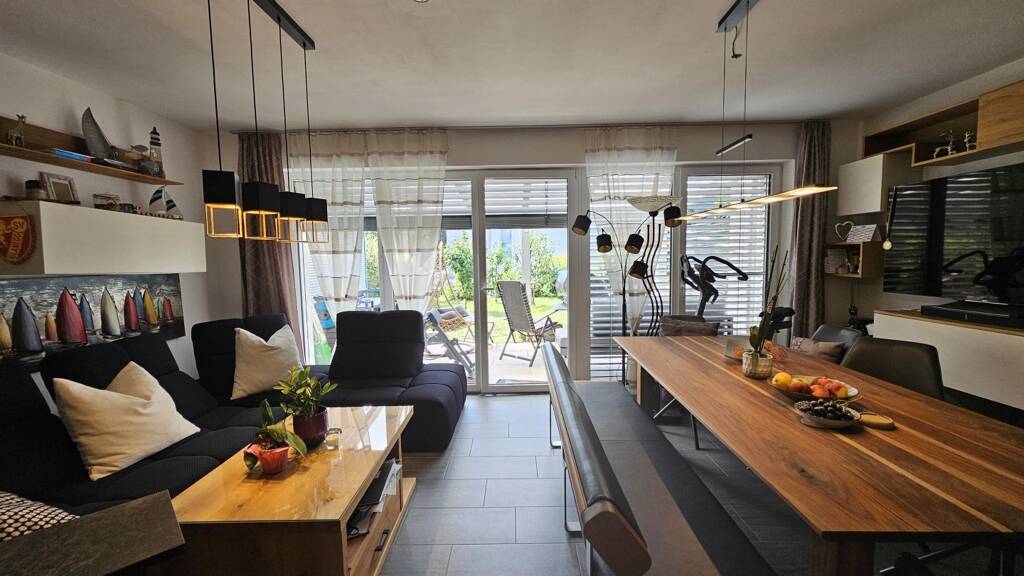 Diese Wohnung ist mehr als nur vier Wände - sie ist eine Einladung, das Leben zu genießen. Bodentiefe Fenster lassen das satte Grün Ihres eigenen Gartens in den großzügigen Wohnbereich strömen. Der Übergang zur Natur ist fließend. Eine großzügige Terrasse mit transparenter Überdachung erweitert Ihren Wohnraum ins Freie und schafft den perfekten Platz für entspannte Stunden vom Morgen bis zum Abend. Hier können Sie die Sonne einfangen und den Blick in Ihren Garten nach Süden schweifen lassen.