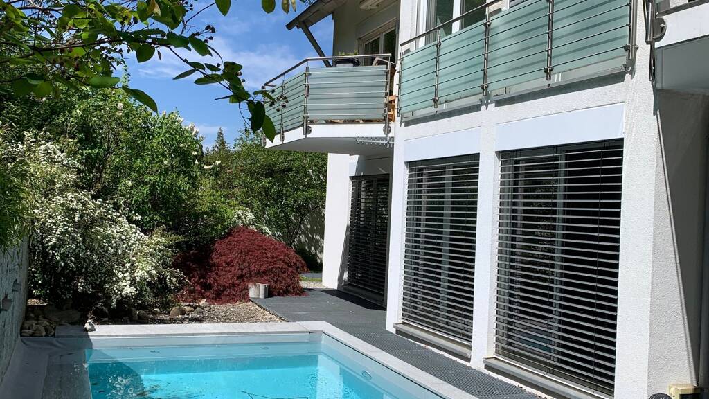 Der Garten wurde aufwendig vom Landschaftsgärtner mit unterschiedler Bepflanzung und Natursteinelementen gestaltet. Ein Swimmingpool mit Wasserfall, ausgestattet mit modernster Wärmepumpentechnik und Gegenstromanlage, ist ein weiteres Highlight bei diesem Angebot. Alle Balkongeländer sowie die gesamte Zaunanlage um das Grundstück sowie Briefkastenanlage ist in hochwertigem Edelstahl ausgeführt.