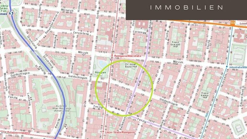 Die Liegenschaft ist im 14. Wiener Gemeindebezirk unmittelbar beim Reinlpark - sehr ruhig in einer Seitengasse gelegen. Zahlreiche Einkaufsmöglichkeiten und Lokale sowie Ärzte, Kindergärten und Schulen stehen im fußläufigen Umkreis zur Verfügung. Die Einkaufsstraße _Hütteldorfer Straße _ist rd. 300m entfernt und bietet alles für den Tagesbedarf. Auch die _Linzer Straße_ mit Supermarkt, Bäckereien etc. ist nur wenige Minuten entfernt.