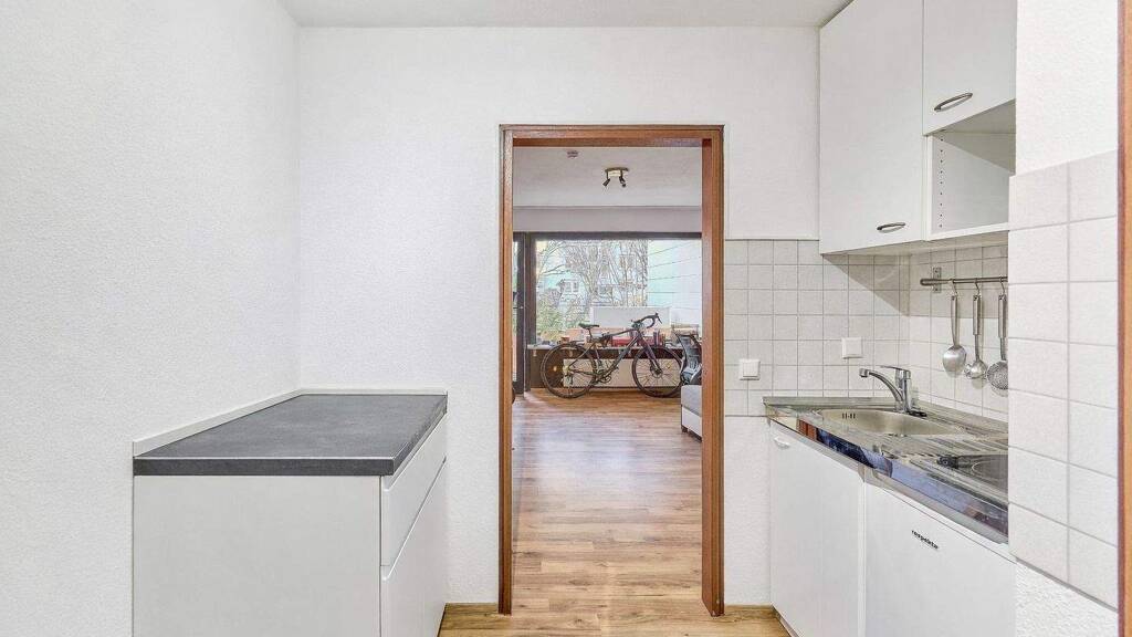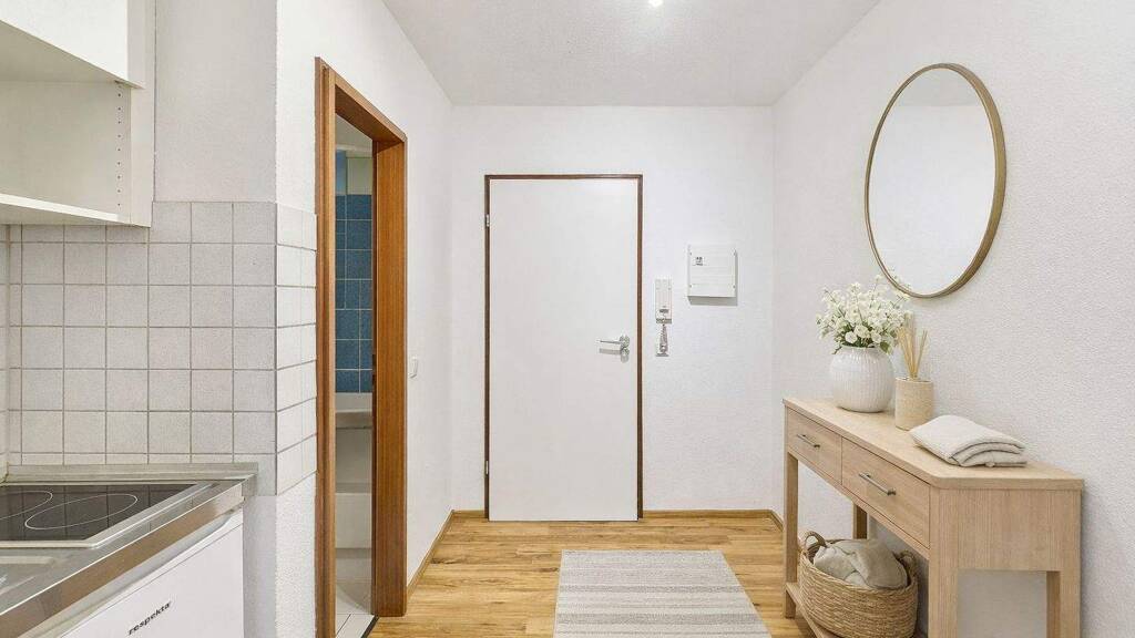 Beim Betreten der Wohnung gelangt man in den Eingangsbereich mit integrierter, praktischer Küchenecke, ausgestattet mit Herd, Spüle und Kühlschrank. Das innenliegende Badezimmer mit Dusche schließt direkt an und präsentiert sich funktional und kompakt.