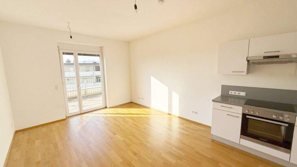 Raumaufteilung: + Wohnraum mit integrierter Küche mit Ausgang auf den Balkon + 2 Zimmer (1x mit Zugang auf den Balkon) + Bad mit Wanne und Waschmaschninenanschluss + separate Toilette mit Handwaschbecken + Abstellraum + Vorraum + Balkon (ca. 16 m²)
