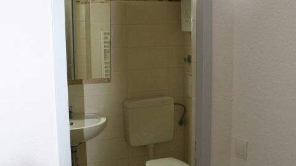 Im Bad befindet sich eine Dusche mit Duschkabine, ein Waschtisch sowie eine Toilette und ein Leiterheizkörper.