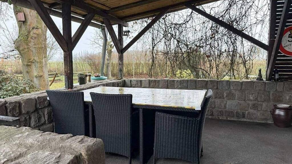 Von der Veranda aus erreichen Sie eine große überdachte Südterrasse hinter dem Haus, auf der Sie den Alltag ausklingen lassen können. Hier ist Platz für eine gemütliche Grillrunde und der Blick kann in den Garten und zum Teich schweifen.