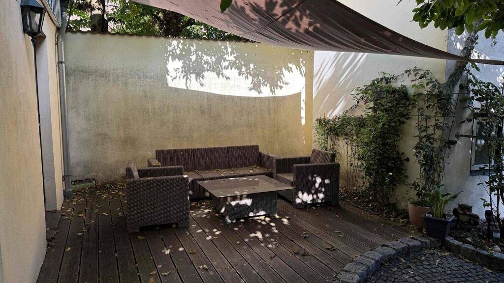Der gepflegte Innenhof bietet eine geschĂĽtzte Terrasse mit Blick in den grĂĽn angelegten Garten.