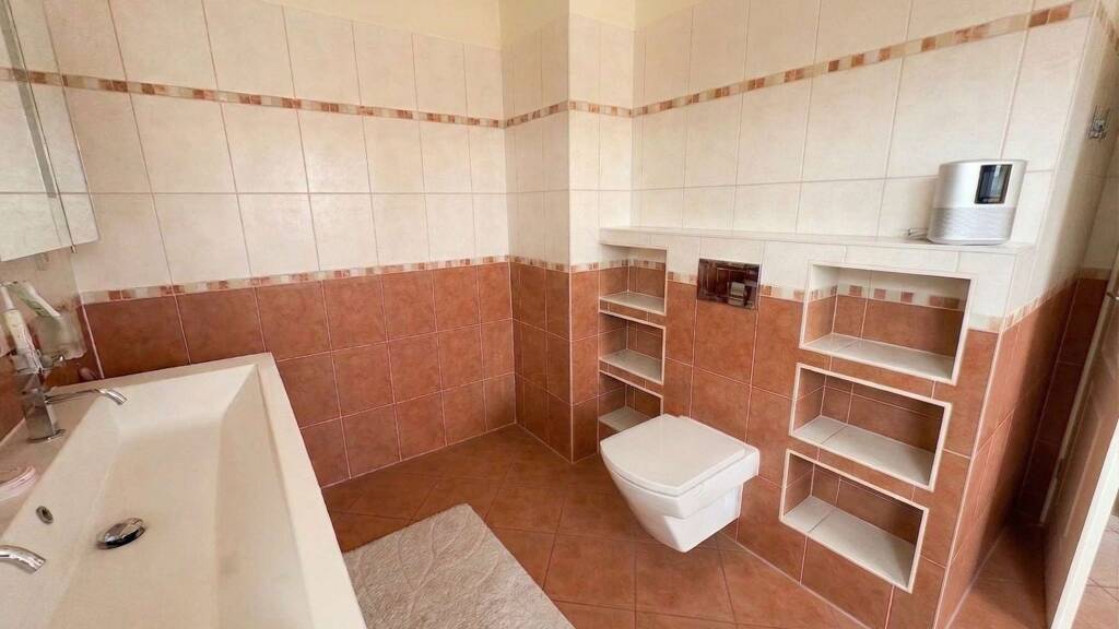 Das Badezimmer beeindruckt mit einer Eckbadewanne und Handtuchheizkörper, während das separate Gäste-Duschbad zusätzlichen Komfort bietet. Alle Räume verfügen über Fußbodenheizung, gesteuert über das neue Heizsystem mit Erdwärmepumpe der Firma Viessmann (April 2026) und eine unterstützende Solarthermie. Die Hausausstattung erfüllt höchste Ansprüche: elektrische Rollläden (zentral steuerbar), maßgefertigte Plissees, Alarmanlage mit Videoüberwachung, Glasfaseranschluss (Telekom) und Kabelinternet (Vodafone).