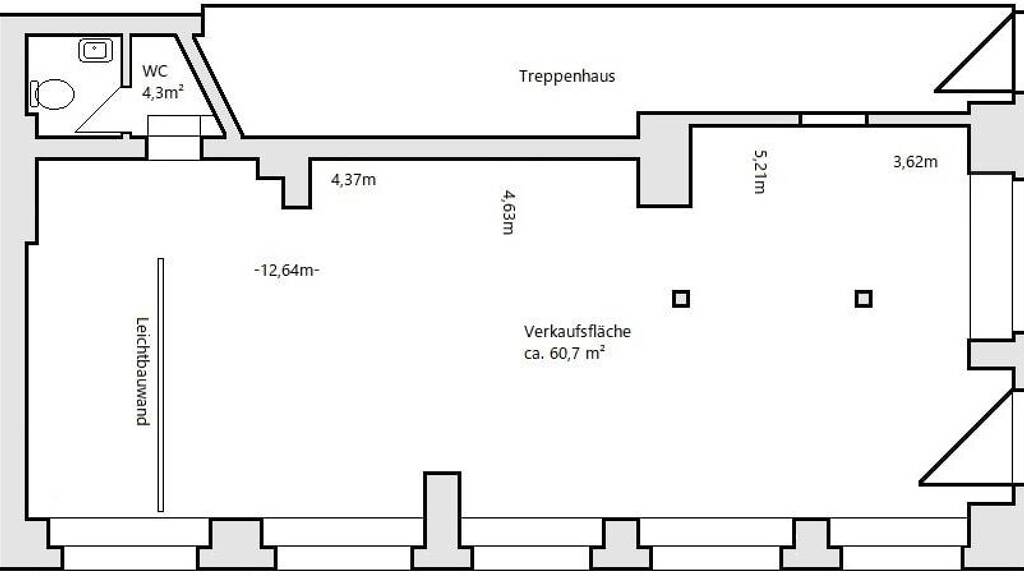 Ladenlokal mit 6 großen Schaufenstern zu 2 sehr frequentierten Straße. Raumaufteilung optimal. Wenig Nebenfläche!