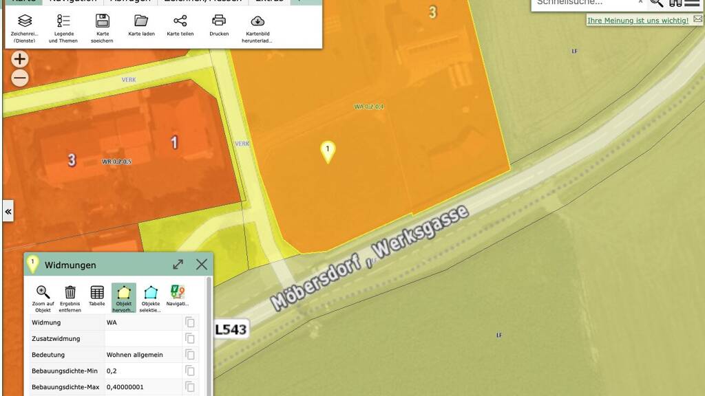 Das Grundstück ist eben, rechteckig geschnitten und liegt in einem aufgelockerten Siedlungsgebiet. Die Widmung WA - Allgemeines Wohngebiet 0,2 - 0,4 ermöglicht eine wohnbauliche Nutzung gemäß den örtlichen Bebauungsrichtlinien.