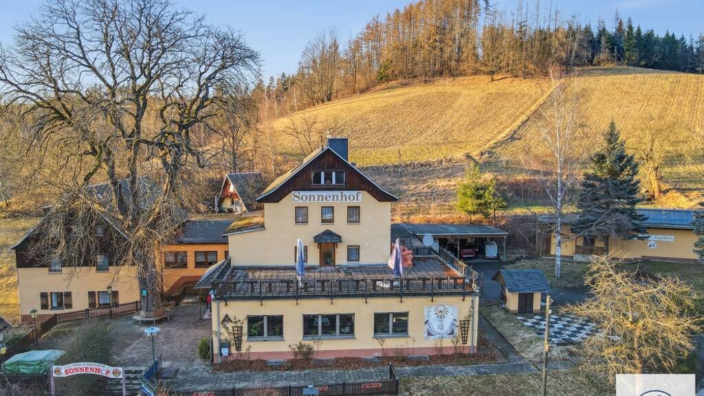 Die ehemalige Pension & Gaststätte "Sonnenhof" begeistert mit über 800 m2 Wohn- & Nutzfläche, die sich harmonisch auf das Haupt- & Nebengebäude samt Anbau verteilen.
