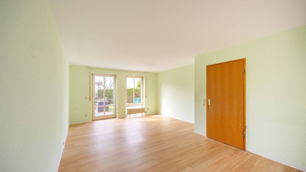 Auf der linken Seite des Flurs eröffnet sich das Herzstück des Hauses: das helle und großzügige Wohnzimmer. Große Fensterflächen sorgen für eine lichtdurchflutete Atmosphäre und schaffen eine angenehme Wohnqualität. Von hier aus haben Sie direkten Zugang auf die Terrasse sowie in den nach Süd-Westen ausgerichteten Garten. Dieser lädt insbesondere in den warmen Monaten zum Entspannen, Spielen oder geselligen Beisammensein ein und bietet ausreichend Platz zur individuellen Gestaltung.