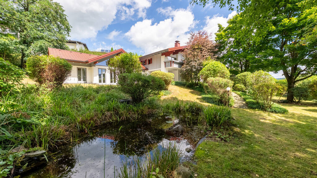 Der Garten erstreckt sich über etwa 1.300 m² und überzeugt mit absoluter Ruhe, einer großzügigen Terrasse sowie einem Indoor-Pool - Ihr privates Paradies für entspannte Sommertage. Auf dieser Ebene finden Sie zudem einen weiteren Wirtschaftsraum, ein Badezimmer, ein separates WC sowie einen idyllischen Teich auf dem Grundstück.