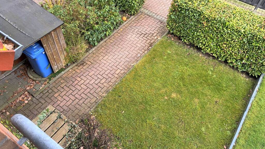 Der rückwärtige Grundstücksbereich bietet eine Terrasse sowie einen praktischen Geräteraum. Im vorderen Bereich befinden sich ein Mülltonnenunterstand und ein gepflegter Vorgarten.
