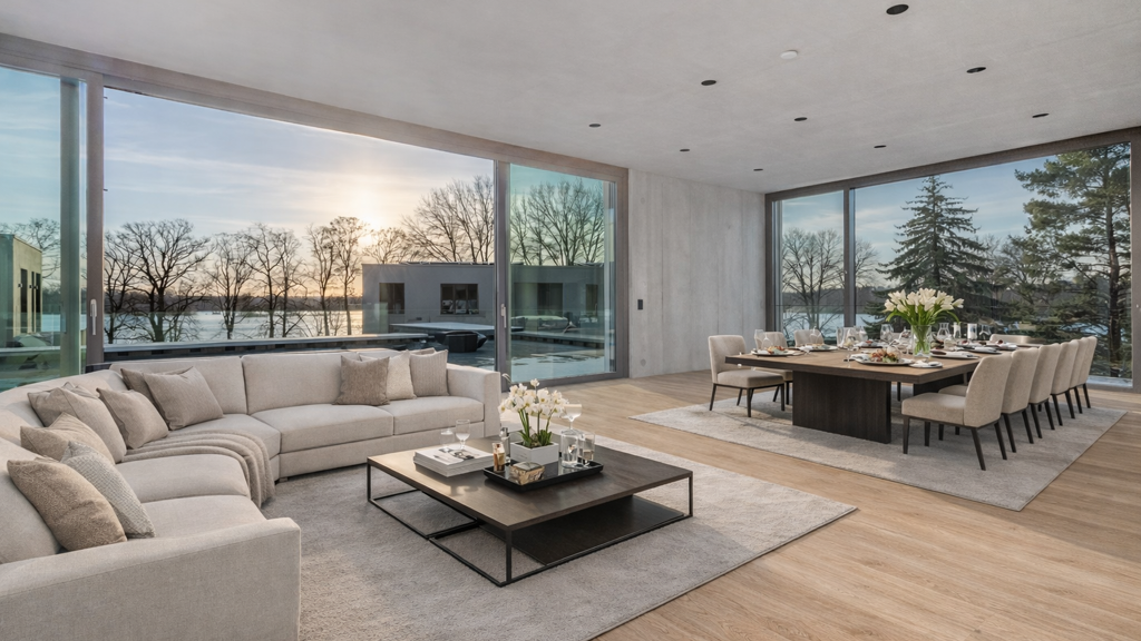 Dieses außergewöhnliche Penthouse vereint zeitlose Architektur, modernste Technik und eine der begehrtesten Wasserlagen Berlins zu einem Wohnkonzept der Extraklasse. Mit direktem Blick auf den Tegeler See eröffnet sich hier ein Wohngefühl, das gleichermaßen von Ruhe, Weite und urbanem Komfort geprägt ist. Die Wohnung verfügt über vier großzügige Zimmer, wobei der Master-Schlafzimmerbereich flexibel gestaltbar ist und sich individuell an persönliche Wohn- und Lebenskonzepte anpassen lässt. Großzügige Raumfolgen, klare Linien und beeindruckende Raumhöhen von ca. 3 Metern unterstreichen den loftartigen Charakter des Penthouses. Der lichtdurchflutete Wohn- und Essbereich bildet das Herzstück der Wohnung. Riesige Aluminium-Schiebefenster-Elemente öffnen den Raum zur umlaufenden Terrasse und schaffen einen fließenden Übergang zwischen Innen- und Außenbereich. Sämtliche Räume sind mit bodentiefen Fenstern ausgestattet und bieten eindrucksvolle Ausblicke sowie ein außergewöhnliches Maß an Tageslicht. Die großzügige Terrasse ist nach Süd–Südwesten ausgerichtet und bietet ideale Bedingungen, um sowohl Sonnenaufgänge als auch stimmungsvolle Sonnenuntergänge über dem Wasser zu genießen – ein echtes Highlight für entspannte Stunden im Freien. Das Penthouse verfügt über zwei hochwertig ausgestattete Bäder sowie ein zusätzliches Gäste-WC. Das Hauptbad präsentiert sich als private Wellness-Oase mit freistehender Design-Badewanne, großzügiger Regenschauerdusche und einem separaten Bereich für die eigene Sauna – Rückzugsort und Spa-Erlebnis zugleich. Die Ausstattung erfüllt höchste Ansprüche: Edler Parkettdielenboden in den Wohnräumen, großformatiges Feinsteinzeug in den Bädern, ein modernes Smart-Home-System, eine nachhaltige Luft-Wärmepumpenanlage sowie Photovoltaik sorgen für Komfort, Effizienz und Zukunftssicherheit. Ein weiteres Komfortmerkmal ist der direkte Liftzugang in die Wohnung. Der Aufzug führt Sie zudem bequem bis in die Tiefgarage, was ein Höchstmaß an Privatsphäre und Alltagstauglichkeit gewährleistet. Dieses Penthouse ist mehr als eine Wohnung – es ist ein exklusiver Lebensraum für Menschen, die Architektur, Qualität und eine einzigartige Lage am Wasser zu schätzen wissen.