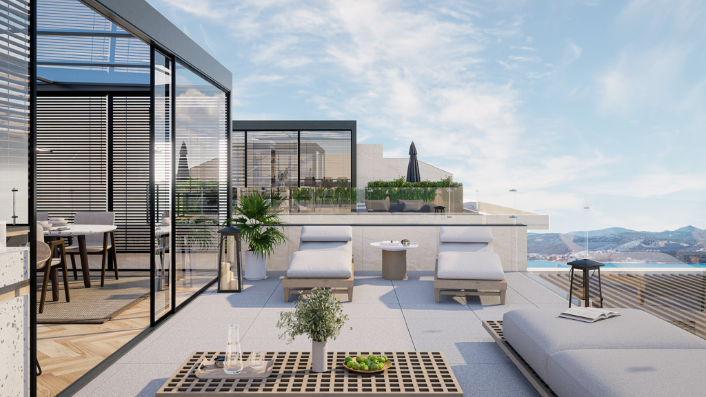 Die gemeinschaftlichen Bereiche wurden mit derselben Sorgfalt konzipiert wie die privaten Wohnräume. Ein großzügiger Poolbereich mit Lounge-Zone, ein Fitness- und Saunabereich, eine Dachterrasse mit Blick auf das Meer und die Altstadt von Trogir sowie ein privater Zugang zum Meer über ein Sun Deck stehen allen Bewohnern zur Verfügung. Eine Tiefgarage und zusätzliche Außenstellplätze runden das Komfortangebot ab.