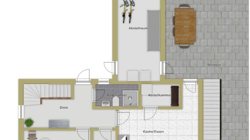 Bereits im Erdgeschoss empfängt Sie ein freundlicher Eingangsbereich. Auf dieser Ebene befindet sich außerdem ein Raum, der bislang als Praxis genutzt wurde und sich ebenso hervorragend als Büro, Gästezimmer oder Hobbyraum eignet. Ergänzt wird das Erdgeschoss durch eine großzügige Wohnküche sowie ein Badezimmer mit Dusche, WC und Waschbecken. Vom Erdgeschoss aus gelangen Sie auf zwei Terrassen, die zum Verweilen im Freien einladen. Die Terrasse im Erdgeschoss ist teilweise durch den Balkon überdacht und bietet Ihnen zusätzlich einen überdachten Freisitz.