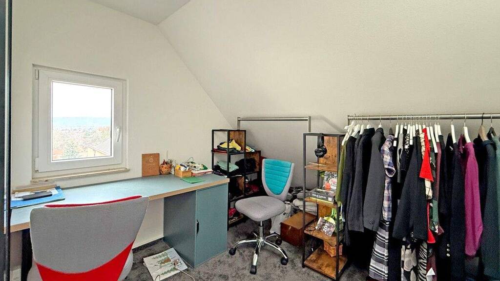 Im Obergeschoss befinden sich zwei gut geschnittene Kinderzimmer sowie ein modernes, geräumiges Badezimmer mit Badewanne, Doppelwaschtisch und separater Dusche. Der ausgebaute Spitzboden dient als Elternschlafzimmer und bietet zusätzlich Platz für ein kleines Arbeitszimmer sowie praktische Einbauschränke.